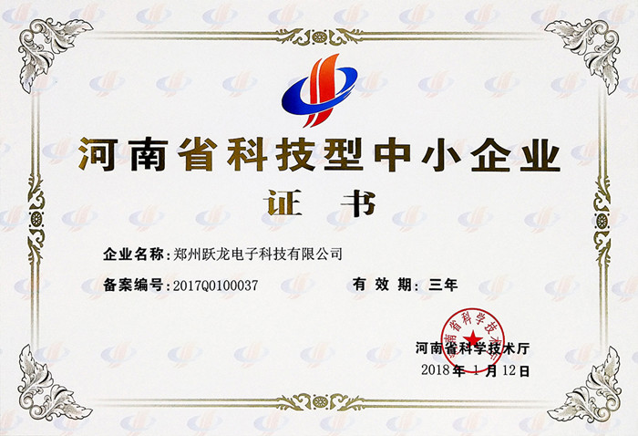 郑州jrs直播电子科技于近日获得河南省科学技术厅颁发的“河南省科技型中小企业”证书,备案编号:2017Q0100037,发证日期:2018年1月12日,有效期三年。
