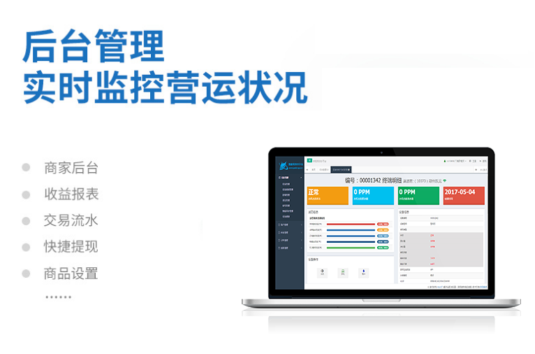 包括但不限于实现以下功能:设备管理、订单管理、结算管理、经销商管理、库存管理、设备充值、配置管理、租赁服务、分润管理、支付消费、数据采集等。
