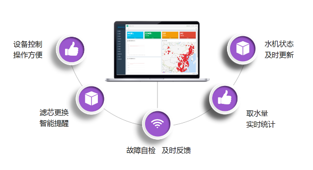 智能监控——家长微信自助绑定感应水卡,无需专人登记发卡;家长可在线充值水卡、查看消费记录;家长微信可实时监测幼儿园直饮水的水质情况;取水信息实时推送至家长微信平台。